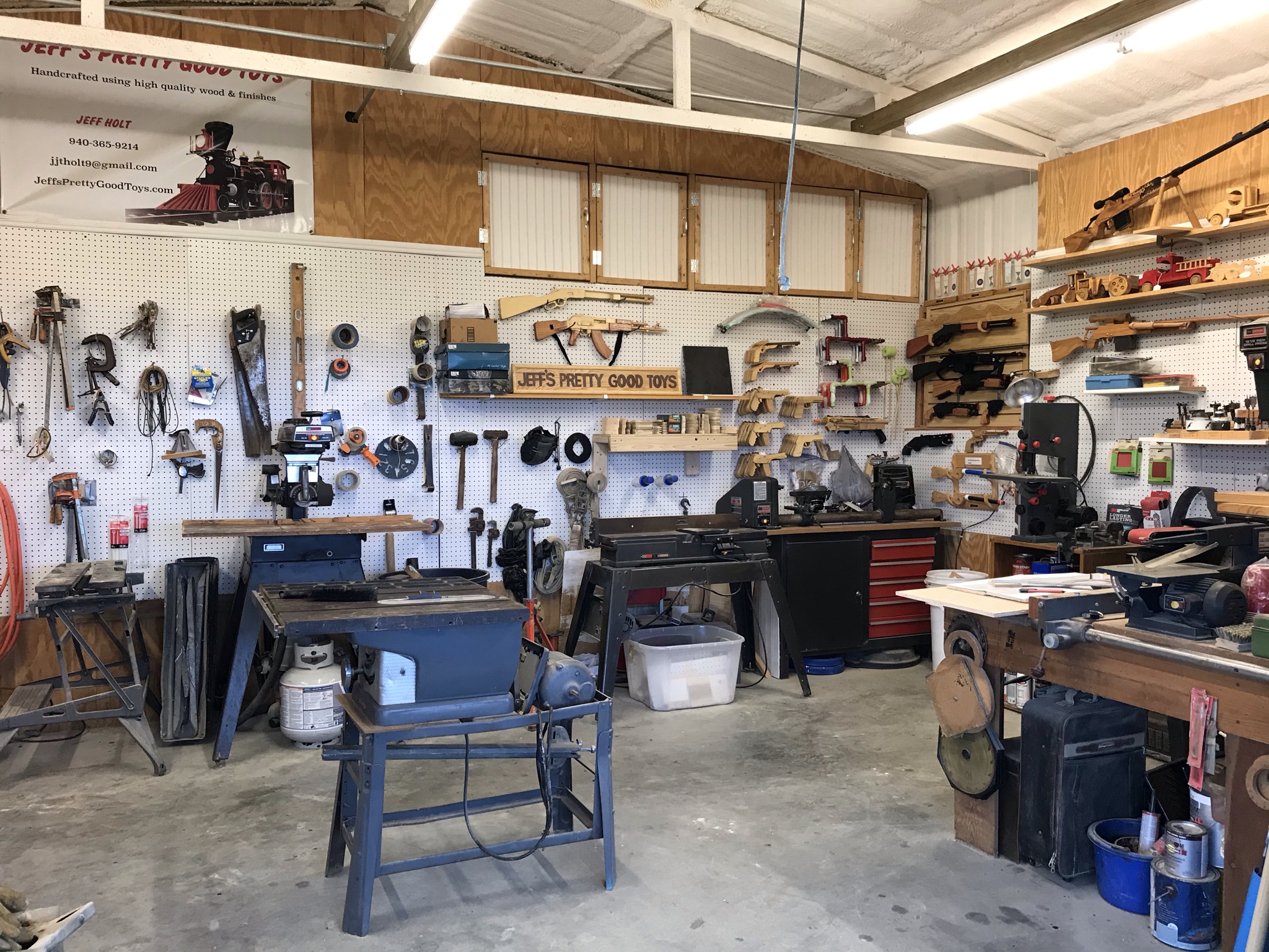 Jeff’s Pretty Good Toys is not a big company.  As a matter of fact it’s a one — man shop : me.  It’s a hobby gone mad.  Really more than a hobby, it’s my passion.   I’m a second generation Master Wood Craftsman, located in north Texas USA.  Hand crafted toys is my thing and if you think about it, in today’s world with all the technology, hand crafted toys is almost a lost art.  I love taking just ordinary boards and transforming them into a rubber band gun, a toy truck, or any of the other (over fifty) wooden toys I make.